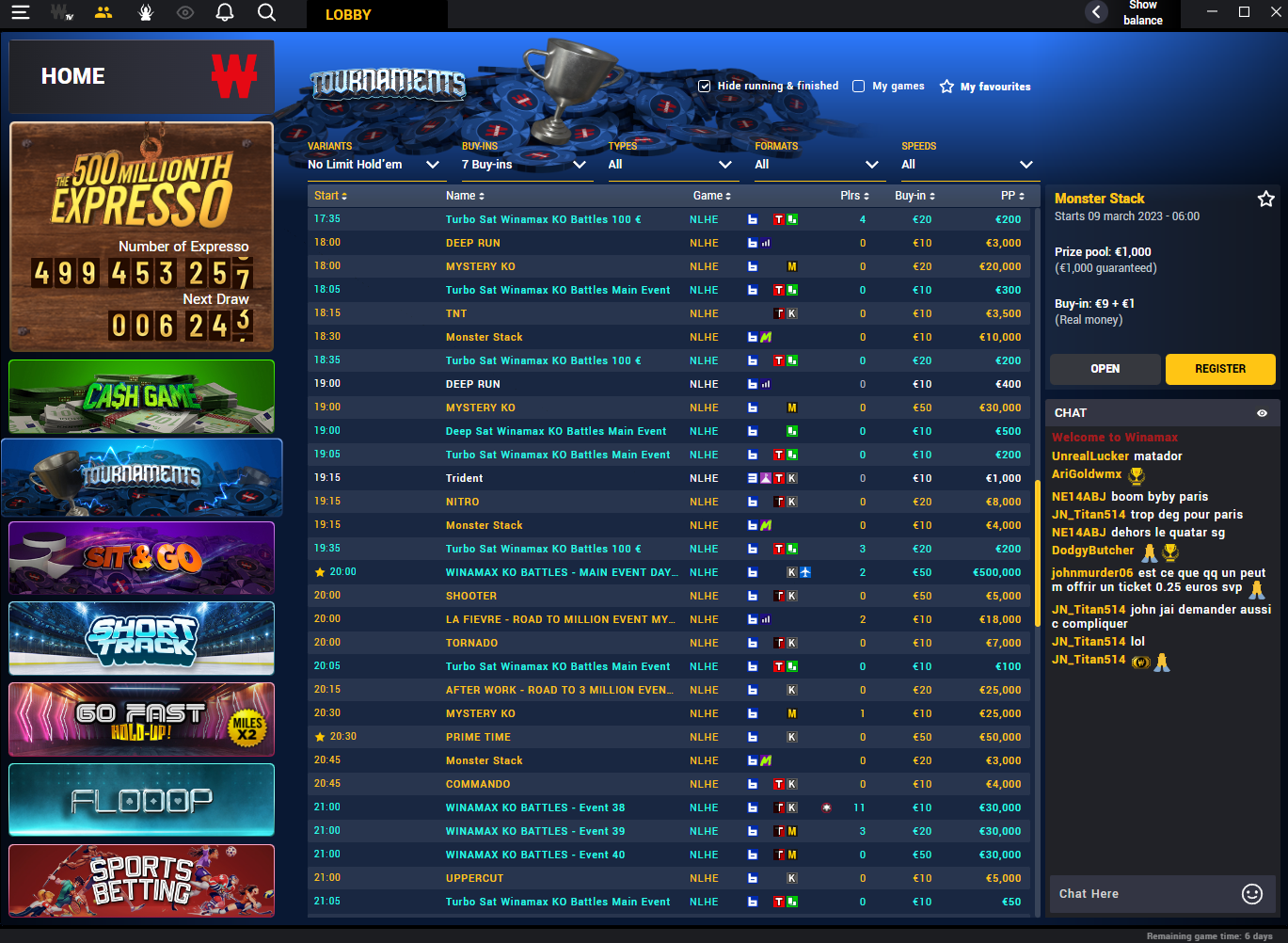 Winamax offers a wide variety of games, including Texas Hold'em, Omaha, 7 Card Stud, and other popular variants. Players can choose from different game formats such as cash games, tournaments, and sit & go's, with varying buy-ins to suit all budgets. Winamax also offers innovative game formats such as Expresso, a fast-paced tournament format that can award players with big prizes in just a few minutes.